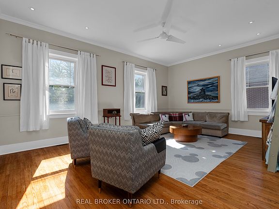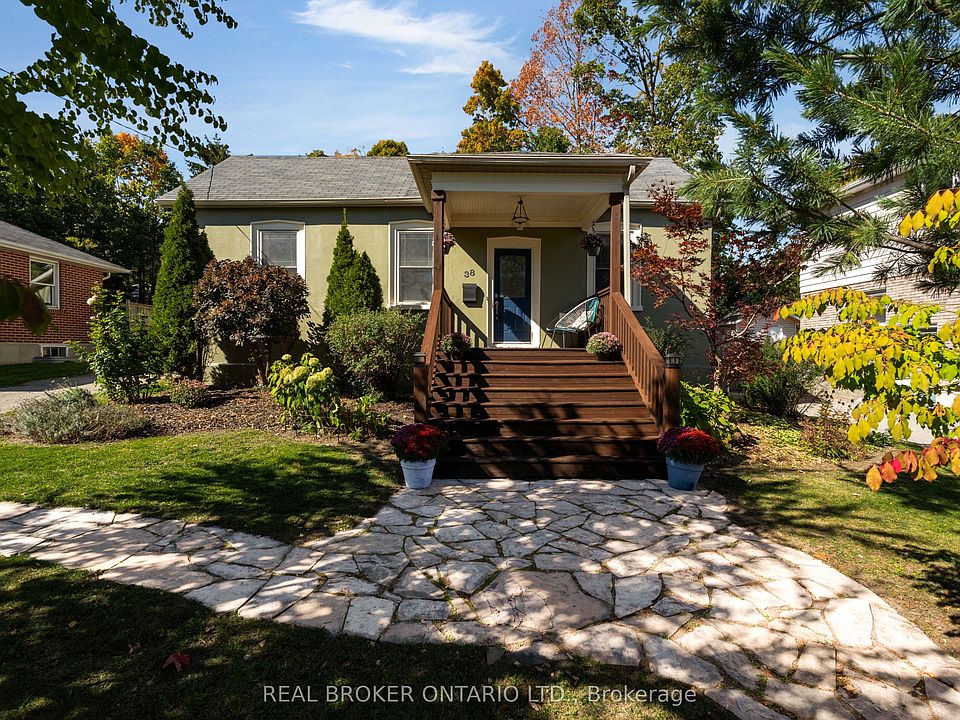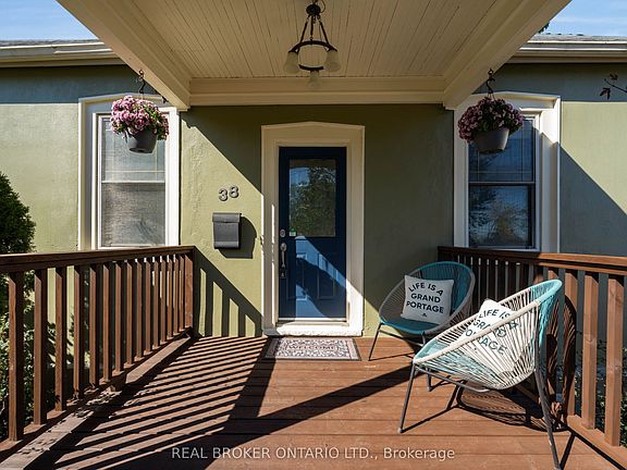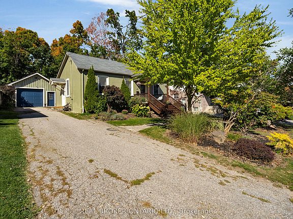 Welcome to this cozy three bedroom charmer with curb appeal private yard and soaring ceilings. Take the flag stone walkway from the long paved driveway through perennials, gardens and nature to your charming covered front porch. Step inside to the immense living space with soaring ceilings, crown moulding, pot lights, sleek hardwood flooring and romantic double sided gas fireplace with granite hearth. The dining space is sun drenched by the sliding doors to the fully fenced yard (right side 2025) where you, guests and your family can enjoy the large deck, pergola and nature. A detached garage is a bonus with 40-amp pony panel which is also drywalled with plenty of extra storage for all of your toys, kayaks and paddle boards (after all you are only 3 minutes to the lake). Back inside the kitchen is functional, adorable and features updated black stainless appliances and a tiled backsplash. A main floor primary bedroom also benefits from the huge ceilings shared in the living space as well as it has hardwood flooring a den perfect for a gym or home office and custom built in wardrobe and organizer with pull out drawers. Another bedroom and updated bathroom with floating vanity complete this level. Downstairs slate flooring adorns the third bedroom perfect for your teenager or visiting family members (or use it as another rec space). There is also a large 3-piece bathroom and an updated laundry room (2024). The house exterior was painted in 2025 and gas meter changed 2025. You are only 1 minute to the Hwy, 2 minutes to the library, 3 minutes to downtown, 3 minutes to a multitude of box stores for all of your shopping needs and walking distance to a handful of schools. Welcome home!
