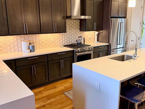 Additional highlights include a Trex deck with a small yard and gas line for grilling, a private 1-car garage with EV charger, tandem driveway parking, and two lower-level bedrooms. One currently used as a home gym with a built-in wall Tonal system available for tenant use.