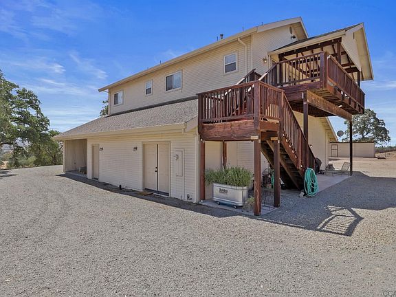 Here is your opportunity to own a prime 5 acre parcel in the foothills with panoramic views of the rolling hills and snow capped Sierras. Surrounded by beautiful homes and located at the end of the road this property has potential beyond belief. In the center of the property sits a well constructed Barndominium with finished living space above the shop, storage rooms and bays below. Large covered deck invites you into the bright and open floorplan with living, dining and amazing kitchen. Inside laundry room, two spacious bedrooms and full bathroom with all the amenities and storage that will blow you away. Below is 1847 sq. ft. finished shop and three storage rooms, 10 ft. doors on both ends and a bathroom. Not included in this sq. ft. are three open bay storage areas to outside. The property is completely fenced, usable, has many oak trees, garden area and out buildings. Whether you are looking for a weekend retreat, full time home or expansion project this is the perfect set up.