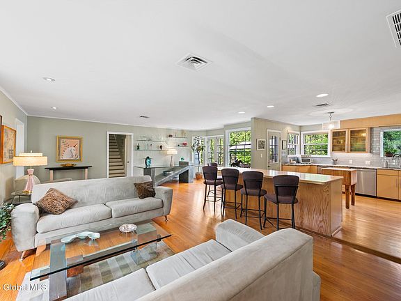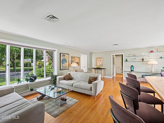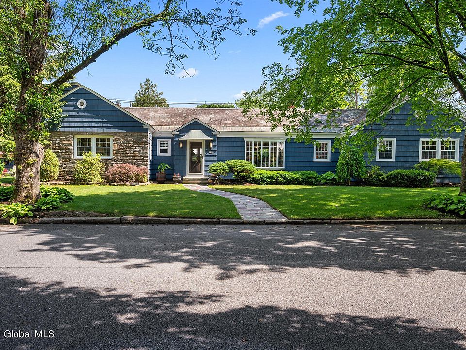 This beautifully maintained mid-century home sits on a quiet, tree-lined street in one of Glens Falls' most sought-after neighborhoods. Mostly one-level living w/ HW floors, built-ins, & large windows offering natural light throughout. The updated kitchen blends modern touches w/classic charm & opens to spacious living & dining areas. The 1st flr primary suite adds comfort & convenience, w/ addtl BRs ideal for guests or office space. Fireplace as decorative only w/potential to install a more modern unit if desired. Enjoy the private backyard, all sides sprinkler system, alley access, & oversized garage w/extra storage or workshop potential. A rare find where timeless design meets modern updates. Taxes includes the water & the sewer.