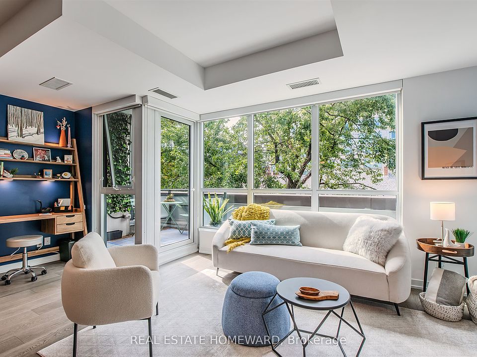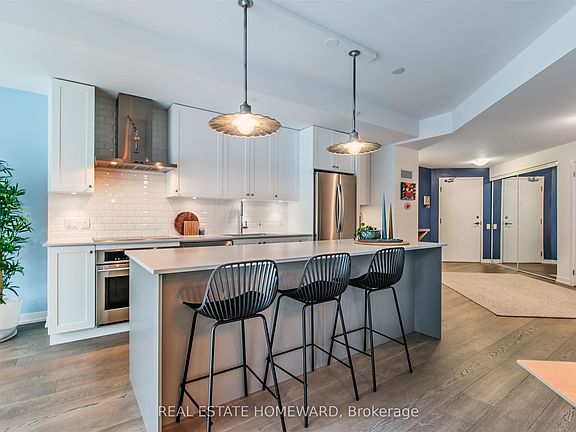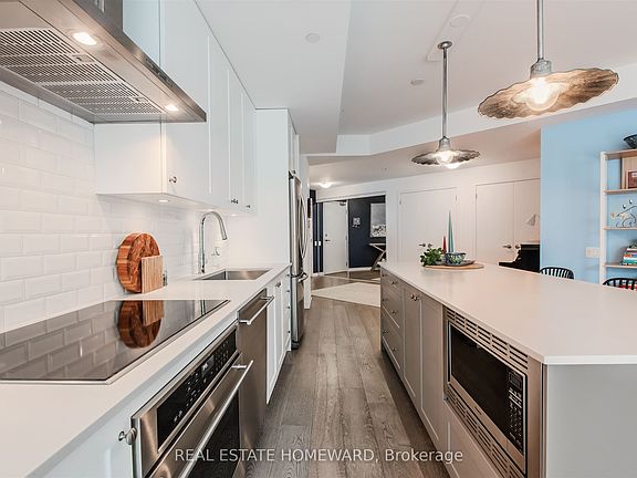 Open the suite door of this 2+1 bedroom in vibrant Roncesvalles that expands out to 1128 sq.ft. of real breathing and living space. In the entry, two sets of connected double doors reveal a wildly impressive storage closet with built-in shelves, drawers, hanging systems & pull-out options. The chef's kitchen is exceptional in size, with counter space galore & one enormous stainless steel undermount sink & gooseneck pull-down faucet for even the biggest cleanups. Upgraded (2024) Electrolux induction cooktop (no more indoor air pollution from gas). The expansive Caesarstone-topped kitchen island stretches on for wide-scale cooking & party hosting, with an abundance of bar stool seating space, soft-close drawers, cupboards, a built-in microwave & power outlets. A handy coffee & wine bar with built-in bottle storage creates a convenient drink station beside the kitchen & dining areas. A unique full kitchen in a condo, leading into the open concept living area & den with a span of northwest-facing windows that bring in glowing afternoon sun through the maple & oak foliage outside. Facing onto the tree-top backyards of Ritchie Street, and away from the neighbourhood sounds of Howard Park Avenue, the living room is a quiet space to enjoy day & night. Within the room the dining area is capable of hosting up to 10 people. Down the hall leads to a second bedroom with a sliding barn-style solid door, closet, and operable window. Next is the main 4-piece bathroom with upgraded polished tiling. The principal bedroom caps off the suite, featuring a walk-in closet with custom shelving and drawers, operable window, and a spacious 3-piece ensuite bathroom with undermount sink & discrete medicine cabinet storage. A quiet balcony provides an outdoor oasis soaked in sun in the afternoon and night breezes after dark, with a gas hookup. Unparalleled space for a life near 300+ acre High Park, the indie shops & restaurants of Roncesvalles, and the waterfront a walk or bike ride away!