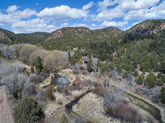 Located just minutes outside the center of Santa Fe, this rare ranch property encompasses approximately 366 acres of land including 1.25 miles of creek on 13 separate lots in a gorgeous mountain setting adjacent to the Santa Fe National Forest. Two ponds near the residential buildings, one of which has a small dock, add a lovely waterside ambience rarely found in the Santa Fe area. Spectacular views of the surrounding forest and the nearby Sangre De Cristo mountains throughout the property are sure to impress. Enjoy easy access to Interstate 25, with an entrance just a short distance away. The 2 bed 2 bath first residence features a bright, open living area with high vaulted ceilings. The spacious master bedroom has its own kiva fireplace and large walk-in closet, and the master bath features both a shower and soaking tub. There is also a nearby 1 bed 1 bath cabin, which boasts a deck and a sizable storage area upstairs. A footbridge leads over a creek to the studio 1 bath residence, located on one of the several ponds with an exterior deck of its own. There are few opportunities to own a property of this caliber; schedule a showing to experience this stunning landscape for yourself.