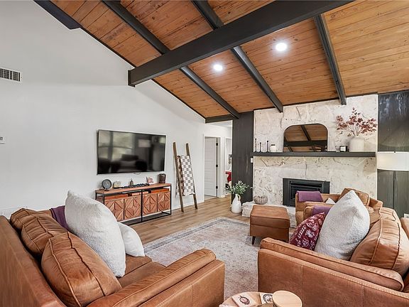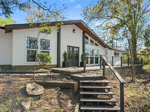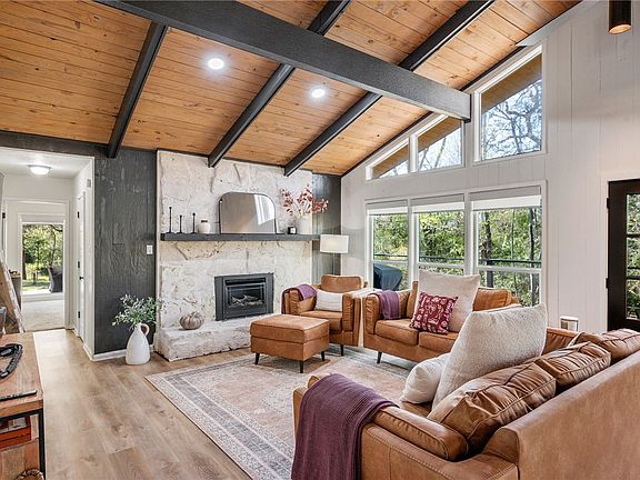 Modern Woodland Retreat on 1.18 Private Acres! Experience the best of both worlds in this exquisitely remodeled modern home, offering peaceful seclusion just seconds from the city limits and on 1.18 wooded acres -- this property is a rare and unique find. The open-concept interior immediately impresses with soaring cathedral wood ceilings, and a statement German schmear gas fireplace. The brand-new kitchen is a showpiece, featuring a massive quartz island, white shaker cabinets, and new stainless appliances. A wall of windows and expansive decks seamlessly blend indoor and outdoor living, offering stunning forest views. The private, spa-like primary suite is your personal sanctuary, complete with a standalone tub and a double shower. With a smart split-floor plan, three additional bedrooms, 2 more full baths, a separate den/office space, and an outdoor firepit, this home is designed for modern living. several large windows, spacious decks, and serene woodland views. Upgrades include: quartz and granite counters, tile backsplash, luxury vinyl plank flooring, gas fireplace, and fresh paint! There is a beautiful wood double front door, drop zone, pantry, separate laundry room -- this home is packed full of must have features!