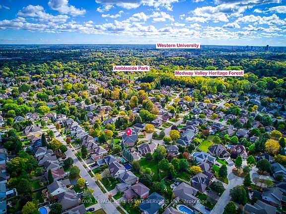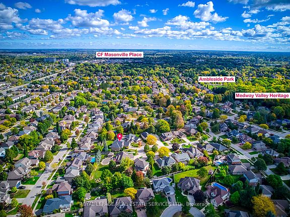 Situated on a quiet cul-de-sac in one of North Londons most sought-after neighbourhoods, this beautifully renovated homecombines contemporary design with timeless charm. Originally built in 1999, it has been meticulously updated from top tobottom, offering a seamless blend of modern comfort, elegant finishes, and move-in-ready appeal within the highly regardedMasonville P.S. catchment.Step inside a sun-filled two-storey foyer that sets the tone for the bright, open layout. The vaulted living room is wrapped inwindows, showcasing elegant White Oak hardwood floors. A spacious dining area connects to the brand-new kitchen withfloor-to-ceiling cabinetry, a five-seat island with prep sink and bar fridge. A garden door leads to a sunny deck and fully fencedyard. The main level also features a guest bedroom with ensuite, a private office with French doors, and a laundry room withcustom cabinetry.The upper level offers three spacious bedrooms, including a primary suite with walk-in closet and a renovated ensuite withdouble vanity and glass shower. Two additional bedrooms are connected by a Jack-and-Jill bath, each with private vanity, onewith a tub/shower combination and the other with a separate shower. The finished walk-up basement offers exceptionalflexibility, with a bright family room and fireplace, large windows, a full bath, 4th bedroom, bonus room, and a spaciousrec/games areaperfect for entertaining or future in-law potential. A nearby pathway connects you to schools, parks, and NorthLondons top amenities, making this home a true lifestyle upgrade.