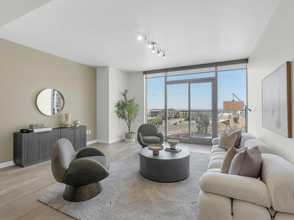 This stylish and one of the largest one bedroom condo floor plans at 975 square feet comes with a versatile den is perfect for a home office, or add a Murphy bed and transform it into a guest space. Thoughtful upgrades include custom interior paint, designer finishes, an bamboo hardwood flooring. The kitchen features granite countertops, stainless steel appliances, and an updated refrigerator. An in unit stackable washer and dryer are also included. Enjoy a bright living room with a Juliet balcony offering beautiful northern views of Levis Stadium and beyond. The bedroom features upgraded carpeting and a ceiling fan, while the bathroom includes updated lighting and a new ventilation fan. Conveniently located near the elevator and equipped with an EV Charger. Live in luxury with 24 hour concierge service, a fully equipped fitness center, clubhouse for entertaining, poolside lounge areas with an outdoor fireplace, and a relaxing jacuzzi. Situated in the heart of downtown San Jose, you're just steps from San Pedro Square, the SAP Center, local farmers markets, the proposed Google Village, light rail, and Diridon Station. Experience the ultimate in urban living, welcome to the AXIS lifestyle.