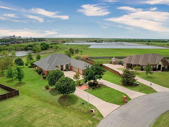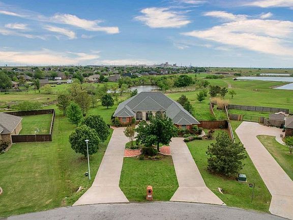 Beautiful home located in Pecan Valley just west of Lawton in the Cache School district. Looking for a spacious floor plan with large rooms? Look no further! This home has it all and is perfectly set up for entertaining. The Kitchen is gorgeous with granite counters,cooking island and stainless steel countertops overlooking the den with a fireplace. Carpet in bedrooms and the rest of the flooring is ceramic tile throughout the living areas, halls and kitchen. The primary bedroom suite is huge with enough room for bedroom furniture and a small sitting area. There are two walk-in closets, one with cedar lining. The ensuite bath has double vanities, separate tiled shower and large whirlpool tub. There is also a formal living room with a tiled floor, separate dining room and 2 1/2 baths. The half bath features a copper sink. The three car garage is oversized and is side entry from a circle drive. There is a great tiled patio area out back plus a big yard with over a half acre that has a sprinkler system and a view over looking a pond. This is one you don't want to miss in a great area and quality school district.