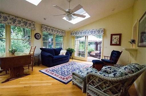 Wonderful, move-in ready, 2 bedroom ranch with hardwood floors & top-of-the-line recently remodeled bathroom. Charming cathedral ceiling in garden room added in 2001 with many windows & skylights; opens to gracious patio with gazebo~ wired Bose speakers & gas grill hook up. Professionally landscaped yard with waterfall & perennials for Spring, Summer & Fall color. Super energy efficient with gas heat & triple glazed replacement windows. Lower level finished with half bath. Covered double carport and loads of storage.