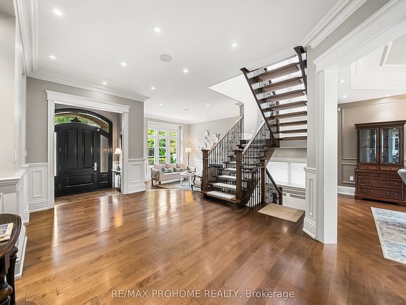 Impeccably designed 5-bedroom home set on a rare 75ft wide lot, offering approx. 4,604 sq.ft. plus a professionally finished walk-up basement. Brilliant craftsmanship & attention to detail are evident throughout with exquisite wainscoting, detailed mouldings & elegant waffled ceilings. The grand foyer leads to formal living & dining rooms ideal for entertaining. Two-storey family room features floor-to-ceiling windows, soaring open-to-above ceilings & custom built-ins flooding the space with natural light. Main-floor bedroom or private office offers flexible living options. Dream kitchen with custom cabinetry, oversized centre island & state-of-the-art built-in appliances. Upstairs primary suite boasts a spa-inspired 7-pc ensuite bath & spacious walk-in closet. Each of the 3 additional large bedrooms includes its own ensuite bath & walk-in closet. The walk-up basement expands the living space with a large recreation room, cigar/wine room, theatre room & nanny/in-law suite with its own walk-out entrance. Exceptional Outdoor Living: Professionally landscaped backyard with extensive stonework, tiered entertaining patios and a built-in waterfall feature creates a serene resort-like ambiance. Multiple sitting/dining areas, a covered porch off the main floor, and a vine-covered pergola lounge make this an entertainers dream and a private retreat for family gatherings. Mature trees, flowering shrubs, and lush greenery ensure year-round beauty and privacy. Prime Location & Amenities: Situated in one of Richmond Hills most prestigious neighborhoods, within walking distance to scenic Lake Wilcox, Lake Wilcox Park & Oak Ridges Community Centre. Minutes to Bayview Avenue, Highway 404 & 407, GO Transit, top-ranked schools, fine dining, boutique shopping, golf courses & lush trails. Easy access to major commuter routes while enjoying a peaceful residential setting.