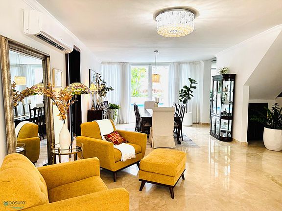 Located in the prestigious Paseo del Parque community, this elegant two-story residence offers the perfect balance between sophisticated style and functional spaces. With a prime location on a private cul-de-sac across from the park and gazebo, the home guarantees privacy and a charming community setting. Upstairs: Four spacious bedrooms with abundant natural light. Master suite with two walk-in closets, private family room, and ensuite bathroom. Two additional full bathrooms. Main Floor: Elegant kitchen with custom mahogany cabinetry and stainless steel appliances. Bright and spacious living, dining, and family rooms. Additional bedroom with private bathroom. Separate office space. One full bathroom for added convenience. Travertine marble floors throughout the home, providing timeless sophistication. Outdoor Areas and Amenities: Beautiful heated pool with Jacuzzi. Elegant outdoor bar and cement-covered terrace, ideal for entertaining. A 20 kW generator and water cistern provide peace of mind and uninterrupted comfort..
