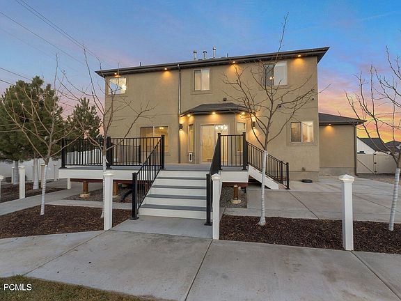 > Concrete porch on the front of the house with new iron railing and a new 20x16 Trex patio deck on the back of the house with iron railing