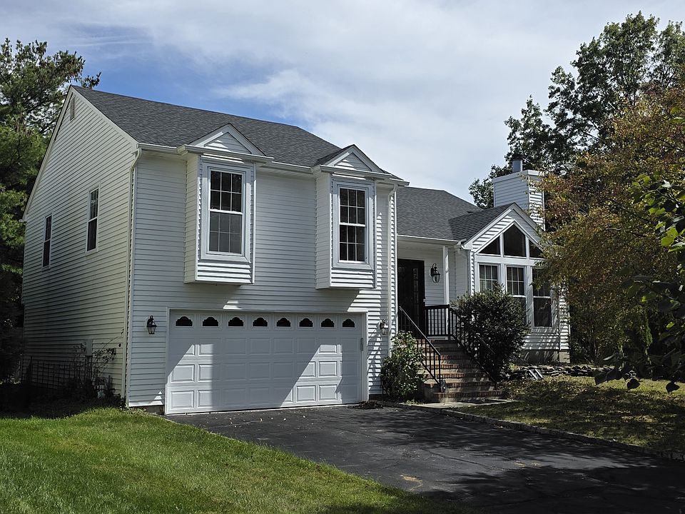 Aunique and beautifully updated home, where spacious rooms, soaring ceilings, and stunning new flooring set the stage for comfort and style. From the moment you enter, you're welcomed by a grand living room with Fireplace featuring a breathtaking cathedral ceiling and a striking banister that enhances the open-concept feel. Downstairs, discover a private guest suite complete with a full bathroom perfect for visitors or extended family. Just outside the suite, a second cozy living area opens to a deck that invites you to unwind while overlooking the serene, beautifully landscaped backyard. Upstairs, the hallway leads to two generously sized bedrooms, a full bath and a primary suite with ared wood floors equipped with a large bathroom and walk-in closet. New Roof New Kitchen with Stainless Steel Appliances . Laundry Room