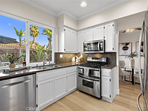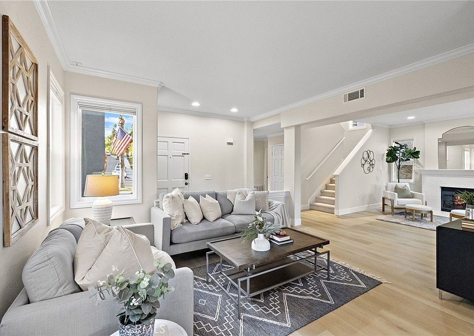 Downstairs, a wall has been removed to create a bright, open-concept floor plan that seamlessly connects the living, dining, and kitchen areas—ideal for entertaining family and friends. The home has been freshly updated throughout with new paint, new flooring, dual-pane windows, stylish window framing, 3.5” baseboards, and elegant crown molding. The remodeled Primary Suite provides a luxurious retreat with its upgraded bathroom finishes. Additional features include a convenient Murphy bed (included with the home), rain gutters, newer air conditioning system, and built-in storage cabinetry in both the kitchen and garage. Step outside and enjoy the custom outdoor living space, complete with an inviting fireplace and a built-in BBQ with direct gas connection—perfect for weekend gatherings and sunset dinners. Situated within walking distance to the Blue Ribbon Melinda Heights Elementary School and close to two large parks and community pools, this home offers the perfect balance of comfort and convenience. Residents also enjoy access to the Santa Margarita Lake and Beach Club, which features four Jr. Olympic-sized pools, tennis, pickleball, basketball and volleyball courts, plus baseball and soccer fields. This is more than a home—it’s a lifestyle opportunity in one of South Orange County’s most sought-after neighborhoods!