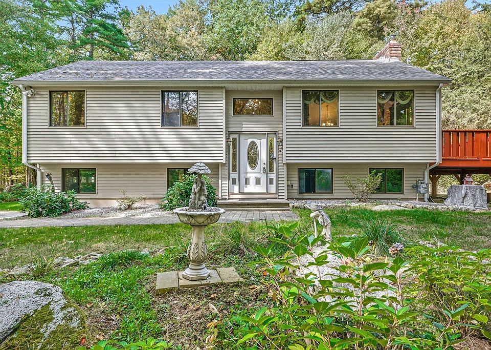 This well-maintained Hopkinton single family multi-split style home is located close to major highways of I-90, I-495 and RT-9, yet has the privacy to bring an oasis of serenity with New England charm. In an outstanding school district and on a 1.53 acre lot, it offers 3 bedrooms + den, 1.5 baths, 1 car garage w/ 5+ off street parking. The living and dining rooms have soaring high ceilings w/ an oversized fireplace, and sliding glass doors leading to the huge deck w/ new natural gas grill for outdoor cooking, making it a perfect place for entertainment. Lower level with 2nd gas fireplace is partially finished for recreational use, including a walkout entrance, half bath with laundry area and the utility room comes with extra space for storage or a workshop. There is a private front yard and flat backyard with the potential to expand the house if desired. Besides the Hopkinton State Park, this house also enjoys less than 5 mins for residents to Sandy Beach and many town trails to enjoy.