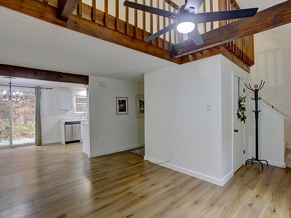 Sliders off the dining area lead to a private patio overlooking peaceful woods, creating a perfect space for outdoor enjoyment. Upstairs, you'll find a lofted common area, overlooking the wood beams, providing versatile space for a home office, guest area, or creative retreat, along with the third bedroom and half bath.