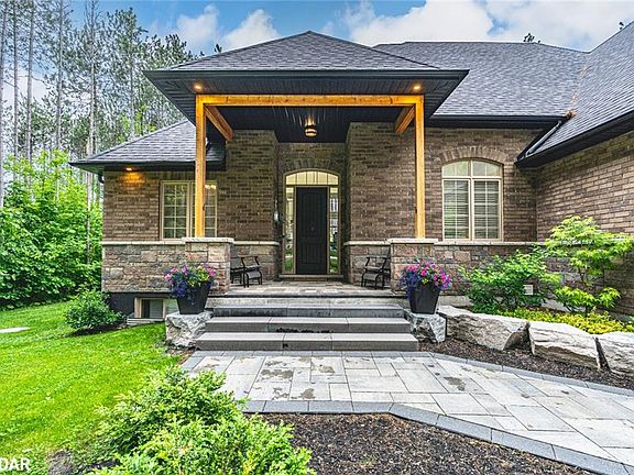 LUXURY BUNGALOFT ON A PRIVATE 1-ACRE WOODED LOT IN PRESTIGIOUS PINEVIEW ESTATES! Arrive home to a residence that turns heads, where upscale design, natural beauty, and sheer presence come together spectacularly at 38 Windermere Circle! Nestled in the coveted Pineview Estates on a lush, forest-wrapped 1-acre lot, this luxurious bungaloft makes a bold statement with its brick and stone exterior, soaring rooflines, covered porch, meticulously landscaped grounds, and an attached heated 3-car garage. Step inside to over 2,300 sq ft of elegant living space featuring 9 ft ceilings, neutral tones, a jaw-dropping great room with 12 ft ceilings, a floor-to-ceiling stone fireplace, and expansive windows framing the surrounding trees. The chef-inspired custom kitchen is a showstopper with quartz countertops, a contrasting centre island with breakfast bar, high-end stainless steel appliances including a gas range with a decorative range hood, built-in Bosch coffee system, and a side-by-side refrigeration/freezer set. The dining area is ideal for gathering and features a walkout to the deck, offering a seamless transition to outdoor entertaining. From the elevated deck, stairs lead down to a beautifully designed backyard, where a spacious stone patio is framed by armour stones and bordered by manicured garden beds. Three spacious bedrooms include a primary with a walk-in closet and lavish 6-pc ensuite. The main floor laundry room is equipped with a laundry sink and provides access to the garage, while the spacious upper loft offers flexible potential as a media room, home office, or playroom. An unfinished basement with high ceilings, look-out windows, and a separate entrance provides potential for future living space or multi-generational use. With upgrades like central vac, ERV/HRV system, air exchanger, and automatic garage door remotes, this is a home built for lasting comfort, elevated living, and an exceptional lifestyle in one of the area's most exclusive communities!