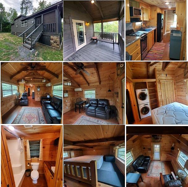 Super-energy efficient solid log cabin with stone accents and features smart use of space. This modern cabin measures 12' wide X 42' long, including attached 8' x 12' screen porch. 1br/1ba + loft + screen porch + firepit.