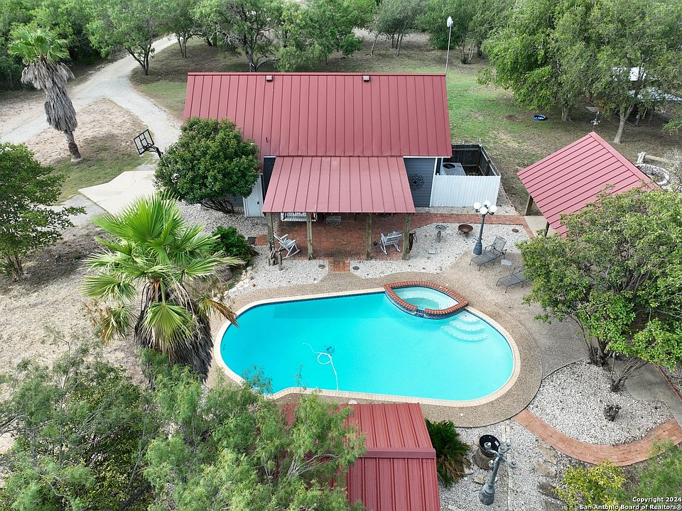 Don't you wish you could down-size and find that little farm house in the quiet countryside just like you've always dreamed about? Here it is!! A 5-acre gated property, with all the privacy and peacefulness you can ask for! This 2-story charming farmhouse with a 9-foot ceiling downstairs and cozy front and back patios is a must see. It's a 2-bedroom, 1-bath cutie with a huge covered carport, and a new roof (2022)! Down-sizing is where it's at, especially if your dream is to spend more time in the peaceful outdoors. You and your guests can enjoy relaxing in the beautiful in-ground swimming pool, eating delicious barbecue made in your very own smoke house, and seated under a charming covered pavilion. This is year-round outdoor pleasure with that heated swimming pool, a fire pit, plus an amazing outdoor fireplace. Come see what country living is all about!!