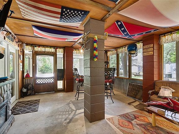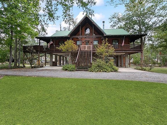 Imagine owning a riverview home that's truly captivating. Nestled at the corner of the river tributary, this exquisite two-story house presents picturesque views and tranquil scenes and has a private boat launch. The charming log cabin exterior harmonizes perfectly with its natural surroundings, striking a balance between urban convenience and rural charm. Inside, there's something for everyone – from the inviting downstairs 760 sq ft man cave or she shed with a private half bath not included in the living sq footage, great for entertaining or office space, to the fascinating train track that spans the room (though you'll need to provide your own train). A private elevator takes care of cargo transportation to the upper floors, making life easier. The metal roof ensures peace of mind during stormy nights, while the whole house generator, well, and septic system provide added reassurance. And all of this is just a prelude to the main house. Boasting 3 bedrooms and 2 baths in main house, this home offers a cozy wood-burning fireplace, complemented by a wraparound porch for relaxation. The laundry room conveniently sits adjacent to the master bath. The kitchen nook features a built-in desk – opportunity for multitasking while preparing family meals. Lastly, the dining room opens to the back porch, offering captivating views of the river, enchanting moonlit nights, and radiant sunrises. This is a residence that must be seen to be believed. And for the pet owners - there is a pet care hidden fence (electric fence) and the pet collar will remain.