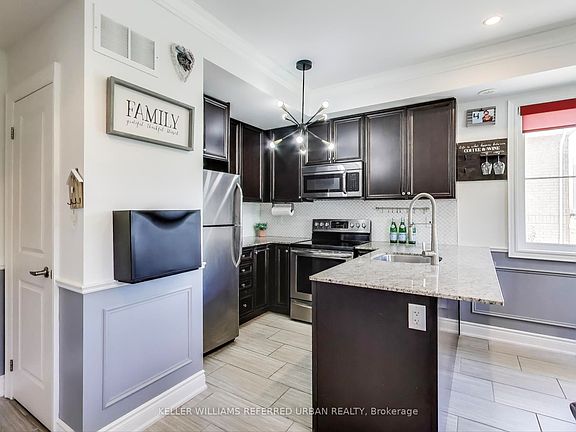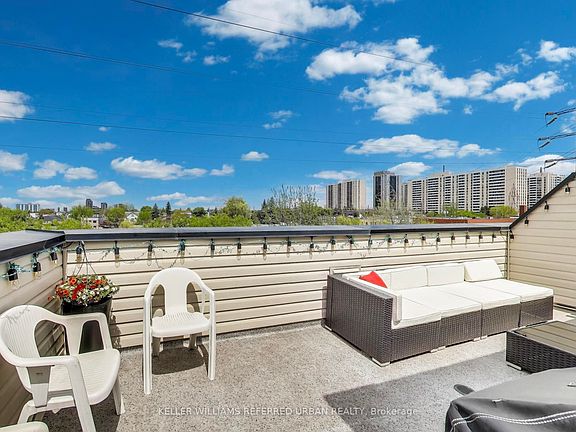 Finally a condo townhouse that doesn't feel like a shoe box or a staircase with a mortgage. This beautifully renovated corner unit at the quiet back of the complex gives you more where it counts: windows on two sides, freshly painted walls, custom wainscotting, and a layout that actually works for real life. The main floor has open-concept living and dining, plus a rare powder room-no more guests sprinting upstairs. The second level features two bedrooms: a generous primary that fits real furniture and a second bedroom perfect for a nursery, home office, or both. Need a break from each other? With living on the main, bedrooms upstairs, and a private rooftop terrace up top, there's room to spread out (and breathe). It's everything you wish you could afford in a detached home but without the seven-figure price tag or the weekend maintenance list. Fire up the BBQ, kick back on the terrace, and enjoy stress-free living. Heated underground parking keeps your car warm and dry all winter, and the garage exit is steps from your front door. Plus, you're just minutes to Walter Saunders Park (with a playground and room to run), and TTC access is a breeze, 4-minute walk to the nearest bus stop, 8 minutes to the subway, and almost as close to the future Eglinton LRT (because yes, its really happening). All in a family-friendly neighbourhood where homes go for double the price. You don't have to compromise on lifestyle just square footage you don't want to clean. Yes, parking and a locker are included because hauling groceries without them is a nightmare. Two bike storage spots for weekend rides or pretending you're that person. All the essentials stay: fridge, stove, built-in dishwasher, stacked washer/dryer, microwave range hood, all light fixtures, and window coverings. Just bring your furniture and your best housewarming playlist. Plus storage for 2 bicycles!