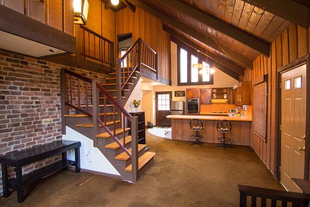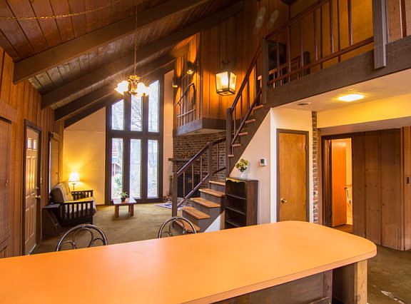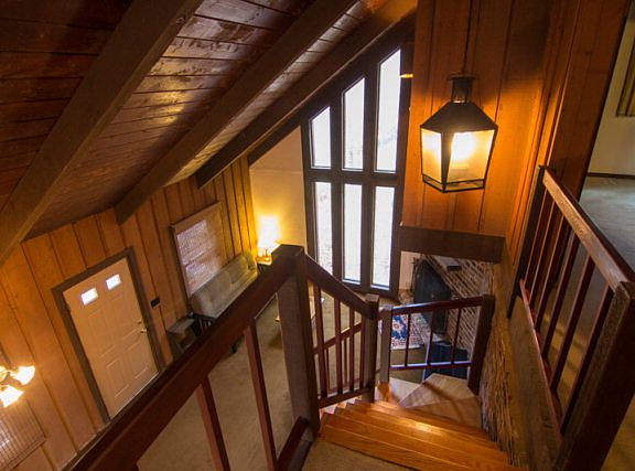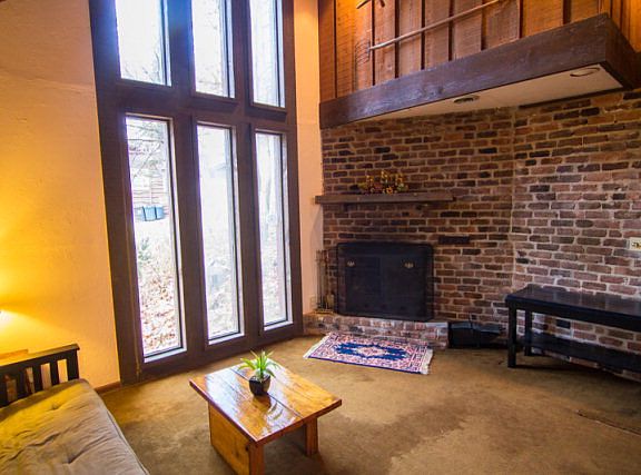 Great getaway, starter home or student rental. Rustic mountain home with beamed ceilings, soaring glass, wood-burning fireplace, brick wall in great room, open-plan great room/kitchen with cathedral ceiling, tongue & groove surface, loft above, spacious kitchen and formal dining/breakfast room. Wooded, private lot with nice winter view, walk-to-AppalCart. Stunning Deal!
