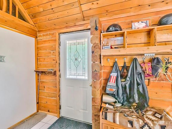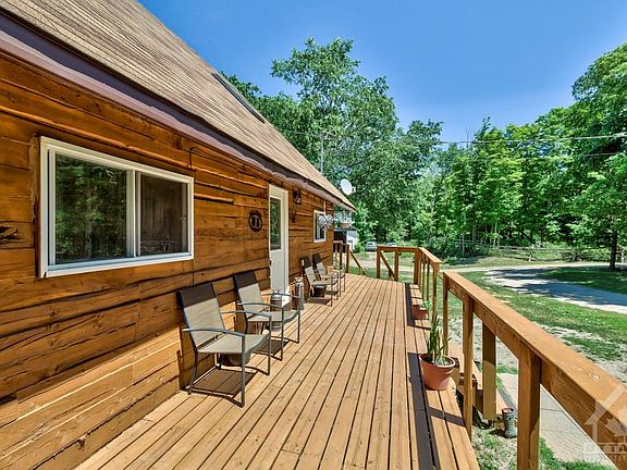 Surrounded by cedar rail fencing, private treed 4+ acres with log home featuring huge expansive decking on three sides. From deck, you step into the foyer open to living room with soaring 15' ceiling. Next to dining area, kitchen with granite countertops and garden doors to the big deck. Main floor primary bedroom has its own patio doors to deck. Main floor 4-pc bathroom with porcelain sink and built-in shelving. Upstairs, pine plank floors and loft (or possible 4th bedroom). Second and third bedrooms have carpet over softwood. Plus, office nook overlooking main floor. Lower level pellet stove, laundry area and door to outside. Lower level also has in-floor heating installed, not yet connected. Buried hydro lines for power to barn, garage and chicken coop. Barn includes tack room with water, three stalls and paddocks. Garage has workshop area with 240V and large loft area. Internet and cell service. Circular driveway. McNaughton Road a school bus route. 10 mins Maberly. 30 mins Perth.