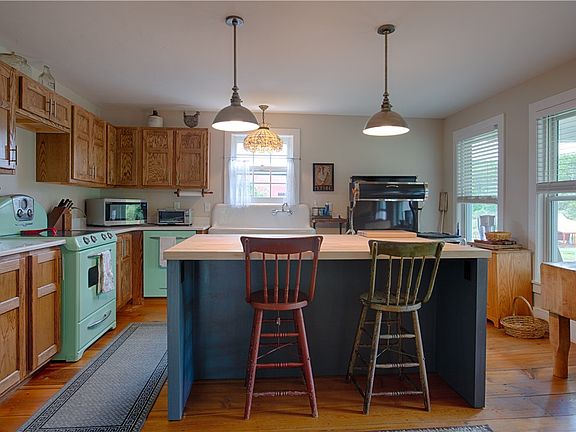 The home’s interior blends traditional elements with thoughtful updates. The kitchen features new cabinetry, retro-style appliances, and a classic English wood cooking stove—ideal for both everyday use and entertaining. Wide plank floors and exposed beams bring texture and warmth to the vaulted living room, creating a welcoming gathering space with views of the surrounding landscape.