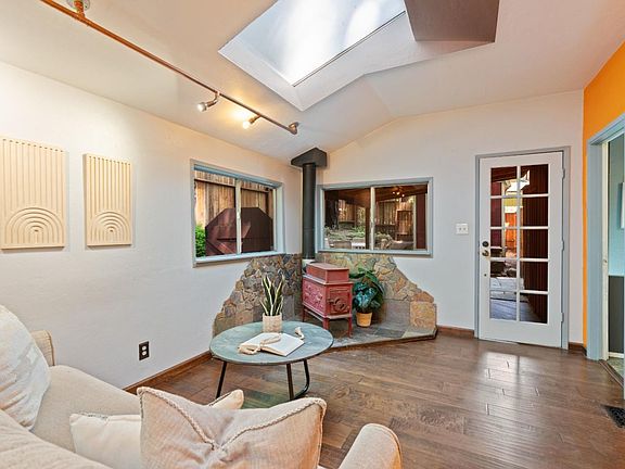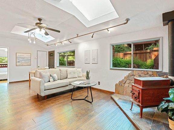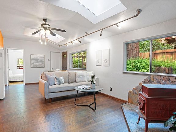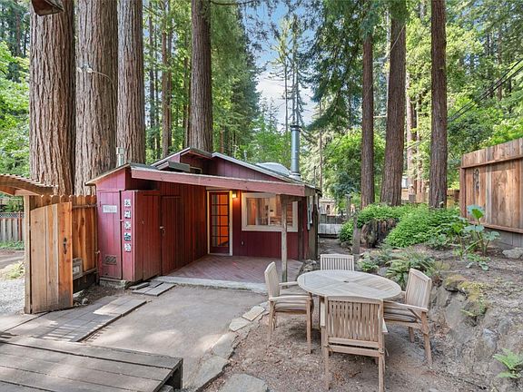 Among the beautiful redwood grove, this idyllic home pays homage to the beauty of San Lorenzo Valley. You'll find solace in the spacious living room, adorned with stunning vaulted ceilings, skylights, and a cozy stove. The ample kitchen features granite counters, generous storage, and a pass-through window to the living and dining areas for effortless entertaining. The roomy primary bedroom boasts a private deck, while a second bedroom with a built-in closet offers perfect versatility for guest accommodation or an office. A charming red barn-styled freestanding office with a loft makes working from home a delightful experience. Step onto the lovely decks and marvel at the lush yard, perfect for barbecues/entertaining and pets. Located near historic HWY 9, this home offers easy access to Santa Cruz and Saratoga, Garrahan Park, The Sawmill Restaurant & Ale House, and downtown Boulder Creek's diverse shopping and dining options.