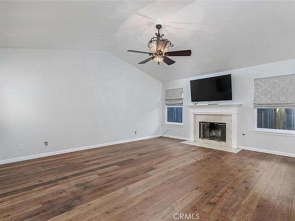 The upgraded kitchen boasts a raised ceiling, updated cabinetry, custom windows, quartz countertops, a contemporary tile backsplash, and stainless steel appliances. An inviting open-concept layout with vaulted living room ceilings, luxury vinyl plank flooring, new carpeting, and a cozy fireplace makes this home perfect for both everyday living and entertaining.