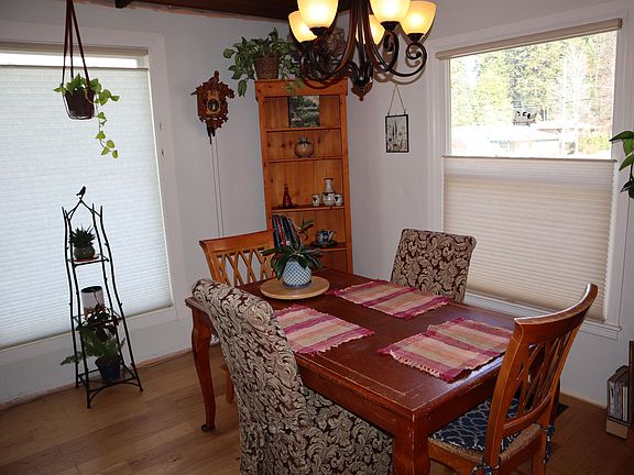 Great location on this downtown Quincy home. Located on a quiet cul-de-sac street just above Quincy Elementary. Step into this home with open concept living. Spacious living area featuring hickory flooring in the dining and living areas. Heated tile floors in the kitchen great for those winter mornings. Sit by the woodstove as you look at the beautiful views of Grizzly ridge from the living room picture windows. Updated kitchen with eat at bar and all appliances included. Spacious bedrooms with corner windows giving you plenty of natural light. Custom window coverings throughout giving you privacy. Updated bathroom with tile flooring and tile shower/tub. Laundry room and pantry area with washer and dryer included. Mudroom leading to the back yard. Outside is a gardener's haven. Upper and lower patios great for entertaining. Small artificial creek in the backyard creating a peaceful paradise. Detached garage great for storage or additional shop space with access off of Alder Street. This home and property has been lovingly cared for and updated over the years.