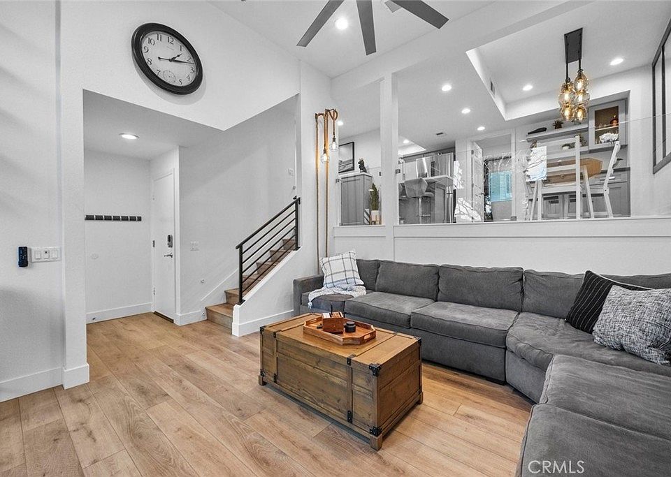 Beautiful End Unit with Park Views in Wilson Park Townhomes. Welcome to this highly sought-after end-unit townhome overlooking Wilson Street Park in the heart of Costa Mesa. Offering no one above or below, this updated 3-bedroom, 3-bath tri-level home spans 1650 sq. ft. and is filled with natural light, soaring ceilings, and stylish modern finishes. The main level features a spacious living room with vaulted ceilings, a cozy gas fireplace, gorgeous luxury plank vinyl wood-grain flooring with 6" baseboards, and large sliding doors that open to a private front patio, perfect for relaxing or entertaining. Heading up to the second level, you’ll notice updated railings and a newly added storage cabinet at the top of the stairs for extra convenience. The contemporary kitchen has been opened and updated with stainless steel appliances, shaker-style cabinets, quartz counters, a modern tile backsplash, and tranquil park views. The adjacent dining area overlooks the living room below, creating an open, airy feel. This level also includes a mid-level bedroom, home office, or guest space with an en-suite bathroom. The top level hosts the primary suite, featuring a custom floor-to-ceiling wood headboard reflecting today’s designer trends, along with dual walk-in closets and a private balcony. The beautifully remodeled en-suite bath includes dual sinks, designer tile, and an elegant infinity shower door. A second light-filled bedroom with a large walk-in closet, another full bath, and an in-unit laundry area complete the upper floor. LED recessed lighting, new hardware, updated lighting fixtures, and ceiling fans have been thoughtfully upgraded throughout. Keyless entry and a smart camera doorbell have been added. Additional highlights include a ground-level, direct-access 2-car garage with a 220V car charger, a new garage door, ample storage, and close proximity to the community pool and spa. This prime location offers easy access to the 55 and 405 freeways, John Wayne Airport, shopping, dining, and is less than 3 miles from the beach. Don’t miss this exceptional opportunity. Schedule your showing today!