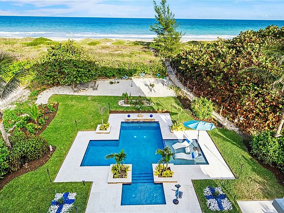 Secluded oceanfront retreat in exclusive 10-home enclave nestled far from A1A. This modern estate offers 75 ft of direct ocean frontage w/private path to the beach. Indulge in the ultimate beachfront lifestyle by floating in the heated pool, sipping cocktails in the hot tub, or enjoying the expansive outdoor living spaces. Multiple balconies invite you to enjoy the sea breezes. Primary suite occupies entire 3rd flr w/his-&-hers bathrooms, walk-in closets, laundry, den w/wet bar. Furnished w/coastal inspired finishes. Designed to withstand the elements w/marine-grade paint, impact glass & more