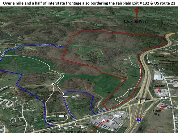 FAIRPLAIN DEVELOPMENT SITE 400 ACRES 400 Acres of prime ground perfect for commercial development. Located right on the I-77 Fairplain Southbound Exit 132 and runs west along the interstate for 1.6 miles. It is becoming increasingly harder to find property of this size that border an interstate that still has adequate access. From the end of the south bond ramp there are approximately 350 feet of road frontage and 3+- acres of flat ground that is ready to build on. Directly across the road is a Love’s Truck Stop and McDonald’s that has a very high traffic count. Land can be subdivided; pricing will depend on the location and size, otherwise buyer takes all for $6,500,000. An additional 200+ acres that attaches directly to the 400 acres can be purchased separately. See pictures Utilities available include: City water with 2 inch water tap, City Sewer, 3 Phase electric, broadband high speed internet, Telephone and Natural Gas. At this time there are no restrictions or zoning. For more information