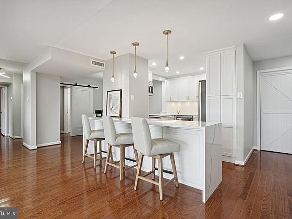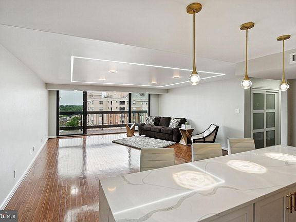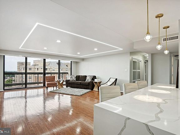 All Utilities included in Condo Fee and available For Sale or For Lease: Introducing a freshly renovated (August 2023) contemporary condo located in the highly sought-after Ballston Clarendon Arlington Virginia corridor. This custom end unit is conveniently located in the upscale Tower Villas community complex along the orange and silver Metro lines just steps away between the Virginia Square and Ballston Metro stations. Offering highlights include: 1,500 square feet of living space with a 120 square feet of a private covered balcony, overlooking the complex’s large swimming pool, and stunning views of the Washington Monument and the Capitol, and a south view of the George Washington Masonic Temple. The epitome of modern living, the revised floor plan creates flow throughout the residence. The contemporary kitchen boasts 42 inch cabinetry, calacatta quartz countertops, hidden electrical outlets and switches and under counter lighting all complemented by a herringbone subway tile backsplash. Additional features include a high-end faucet pot filler, recessed ceiling lights, a breakfast bar, and an adjacent peninsula with a matching quartz waterfall edge, brushed gold teardrop pendant lights, additional cabinet space and counter-height seating. Transcending the ordinary, the living room ceiling features a luxurious radiance featuring linear and recessed lighting embedded in the artistically crafted vinyl stretch ceiling by Velumdesign.com. This ceiling is anti static, anti-microbial, does not attract odors and is moisture resistant. The family/dining space barn door leads to the hall bath with full-sized washer and dryer, and is equipped with a built in ironing center and breakfast bar. The upgraded bathrooms add a touch extra, with the master featuring a double sink vanity, an anti-fog LED mirror and walk-in shower. Both bathrooms updated with luxury vinyl plank flooring and high-efficiency toilets. This condo offers a sophisticated and elegant living experience, combined with unparalleled convenience and luxurious amenities. Renovations completed by a licensed contractor, permitted through Arlington County and with a 12 month warranty transferable to the new owner. Ample closet storage space and beautiful floors throughout, enhance the luxurious feel of this condo. The all inclusive condo fee covers all utilities, Xfinity Internet and TV with HBO, as well as the accommodating 24-hour lobby staff, building engineers and an on premise night-time security guard. Other amenities included are: a fitness center, party room, fax and copying services, a community center with a grill, fire pit, and large swimming pool. A deeded garage parking space conveys with the sale, providing hassle-free, secure, covered parking with EV charging available. Convenience is key, with the Virginia Square and Ballston metro stations, grocery stores, a wide variety of restaurants, and shopping options just steps away. Easy access to major interstate highways such as 66, 395, 495, and 95, as well as routes 50 and 29 with close proximity to Washington National and Dulles airports for convenient air travel. The front desk personnel, management staff, building engineers and porters are not permitted to provide information to Realtors or prospective buyers/tenants.