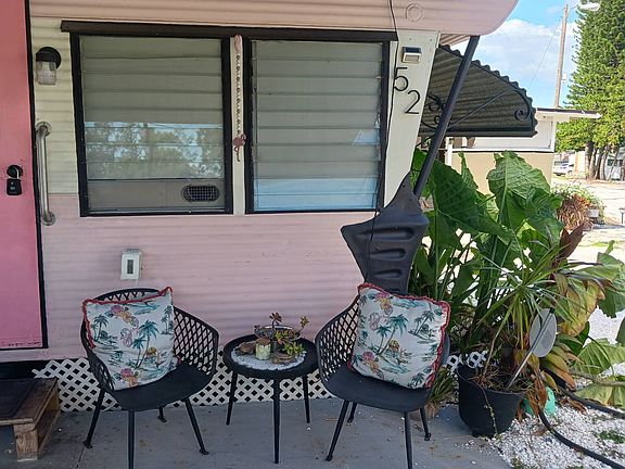 Welcome to this 1957 Era mobile home that was completely redone in the style of the that time. The new subfloors are soild & have new 1950's style Terrazzo vinyl decorative flooring. The bathroom is completely new! New bath tub & accented with a vintage pink sink!! This is an absolutely adorable retro mobile home. Little Pinky, has one bedroom, one bath, a nicely updated kitchen, cozy living room, and the covered carport / patio extends the living space. 55+ community, lot rent is $550, close to shopping & beaches , zone X- non Flood. Great if you want a 2nd home in Florida that's affordable, or year round affordable living. Must see this lil gem in person to appreciate. Call today!