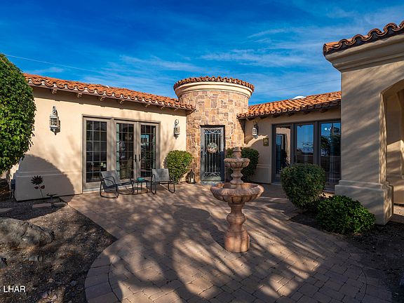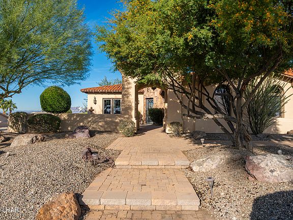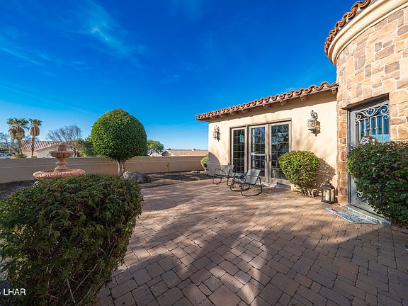 Welcome to this stunning Spanish-inspired residence, originally built by Oxley Construction and situated at the entrance of Havasu Foothills Estates. This 3-bedroom, 2 full bath, and 2 half bath home blends classic Spanish charm with modern comfort, creating a warm and inviting atmosphere from the moment you arrive. Highlighted by an authentic terracotta tile roof, upgraded stucco, mature landscaping, and a paver front entry courtyard with an iron front door, this home offers a private and welcoming first impression. Inside, enjoy an open concept layout with travertine flooring, striking archways, and elegant design details throughout. Natural light fills the home, enhanced by French doors that open seamlessly to the outdoor living areas. The spacious kitchen, dining, and living spaces are perfectly connected for everyday living or entertaining. Each bedroom is generously sized, with the primary suite providing a peaceful retreat. Additional features include a 3-car, boat deep garage ideal for storage or recreational vehicles. A rare opportunity to own a timeless Spanish classic, don't miss it!
