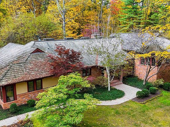 Tucked away at the end of a long private drive, this tranquil retreat unfolds across more than 40 wooded acres in beautiful Bloomington, Indiana. Located less than 6 miles from the Indiana University campus, this custom, one-owner brick home offers 6 bedrooms, 5 baths, and garage space for up to 7 cars. On the main level, an open floor plan unites the kitchen, dining area, and living room, creating an ideal space for everyday living and entertaining, complete with a laundry room and guest bath. The open sunlit kitchen offers a center island, custom cabinets, exposed wood beams and brick accents that add to the home’s charm. It opens to the family room that features a wood burning stove. With built-in cabinetry, the spacious laundry room includes a pantry with plenty of storage and window-filled space that could easily double as a craft room, sewing space, or home office. Upstairs, the primary bedroom suite offers a peaceful retreat with a beautiful view of the private backyard. Three additional bedrooms and two full baths complete this level. The walkout lower level includes a family room with a kitchenette, a fifth bedroom, and a full bath. A second lower level provides the sixth bedroom, another full bath, and a large recreation area plus direct access to the back of the home and garage area. Outside, you’ll find a detached brick 4-car garage with an office, perfect for a car enthusiast. One of the garage bays is large enough to accommodate a motorhome. With over 4,700 finished square feet, this one-of-a-kind home is conveniently close to Bloomington’s east side shopping and restaurants. It showcases distinctive features throughout, including custom millwork, brick accents, abundant storage and beautifully landscaped grounds. This special property offers quality construction, custom details, and stunning natural surroundings ready for new owners to enjoy.
