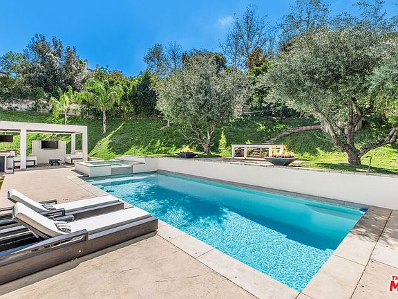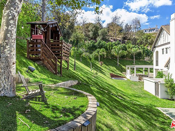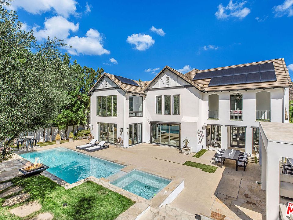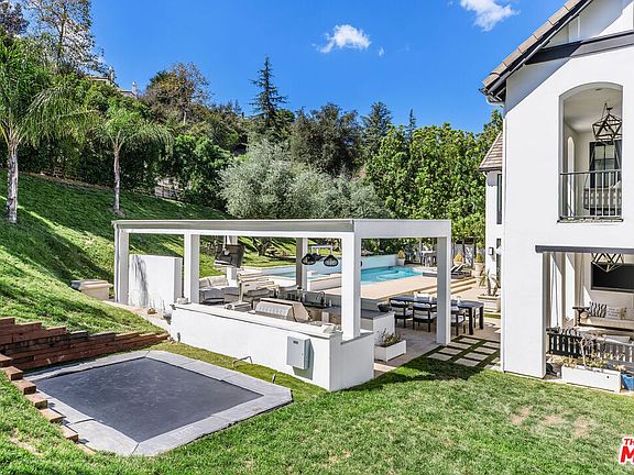 Situated on a coveted corner lot in the exclusive gated community of The Oaks, this stunning estate offers unparalleled privacy and luxury living. Spanning expansive wrap-around acreage, recently updated park-like landscaping and unmatched appeal, the property boasts exceptional outdoor features including a private sport court and a resort-style pool and spa. The outdoor entertaining area includes a covered lounge with a BBQ bar, as well as elevated hillside seating areas, offering a secluded retreat perfect for relaxation and entertaining. Inside, the home exudes stylish sophistication with a modern artistic flair. The expansive family room features a custom modern fireplace and seamlessly flows into a state-of-the-art kitchen, complete with a waterfall stone island bar and striking backsplash. A custom-designed entertaining bar lounge and tasting area further enhance the home's appeal for hosting. A thoughtfully designed kids' lounge is equipped with a fridge, play area, storage, and entertainment space, providing the perfect environment for family living. The lower level also includes a private-entry en suite bedroom, ideal for guests or extended family.The home's state-of-the-art theater room offers a custom cinematic experience, while the second level features four beautifully designed en suite bedrooms, each with unique styling. A cozy living room lounge and a private gym with floor-to-ceiling windows overlooking lush greenery add to the estate's appeal. The primary suite is a luxurious retreat, featuring a custom walk-in closet with accent lighting and a spa-like bathroom with double vanities, an oversized shower, a walk-in dry sauna, and a private glam space. This modern hideaway embodies sophistication and comfort, offering a rare opportunity to experience life in one of Calabasas' most sought-after neighborhoods.With exceptional amenities, ultimate privacy, and breathtaking views, this estate truly redefines luxury living behind the prestigious guard gates at The Oaks.