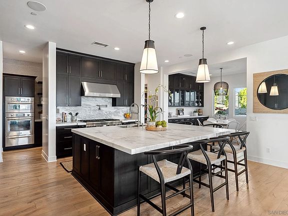 Discover an oasis of refined elegance in the heart of Olivenhain—a modern estate where every detail is curated to perfection. This 5,182-square-foot masterpiece, completed in 2020, epitomizes contemporary luxury, blending innovative design with timeless sophistication. Step through grand entry doors into soaring 25-foot ceilings and an interior adorned with Provensa wide-plank white oak floors, custom black iron balustrades, and distinctive designer accents. The gourmet chef’s kitchen is a work of art, featuring a generous marble island, bespoke glass cabinetry, and state-of-the-art Thermador appliances—including a hidden refrigerator, dual wine fridges, and a built-in Wolf coffee and espresso station. A discreet caterer’s kitchen enhances the home’s entertaining appeal. The resort-style backyard boasts a dazzling saltwater pool and spa with cascading waterfalls and LED lighting. Outdoor entertaining is elevated with a DCS Series 9 Evolution Grill, fiberglass firepit, and bocce court. The great room flows to an outdoor area ideal for gatherings. Additional spaces include an entertainment room and a formal dining area with a kitchenette offering guest suite potential. Upstairs, the primary retreat offers peekaboo ocean views, a spa-inspired bath with a Kohler soaking tub, designer lighting, Hunter Douglas motorized shades, and a private balcony with a fireplace. Set amidst picturesque landscapes near equestrian facilities and walking trails, this exceptional residence has opportunities for an ADU, tennis or pickleball courts, or a vineyard. Schedule your private tour today.