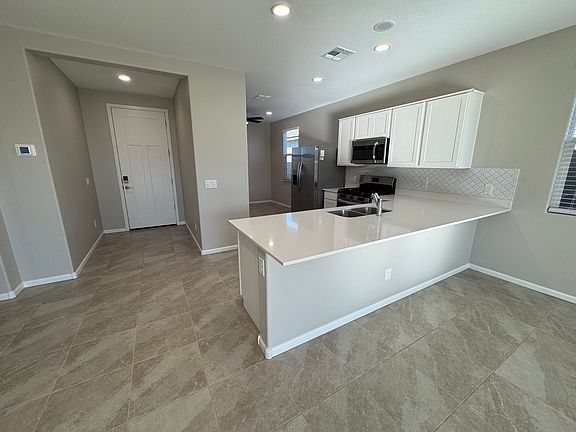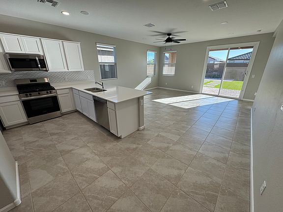 This single-story home has a classic layout. Two bedrooms are situated toward the front of the home with the owner's suite in the back for added privacy. The front door leads to an open concept Great Room, kitchen and breakfast nook with a large covered patio in the back with turf landscaping for easy maintenance.
