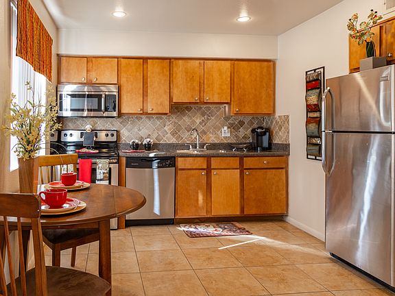 Upgraded stainless steel or black appliances, built-in microwave, tile back splash in kitchen & bathroom.