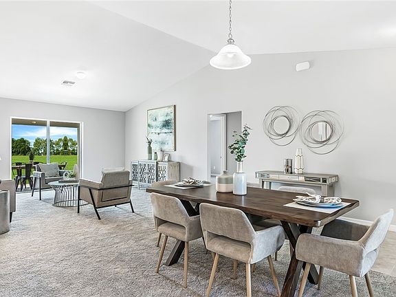NEW CONSTRUCTION WITH WARRANTY! Upon stepping inside the Sanibel, you're welcomed with a large open living space ideal for gathering. The kitchen boasts a freestanding island overlooking the dining and living areas that are under a vaulted ceiling. The living room has sliding doors that open to the covered lanai, creating the perfect indoor-outdoor entertaining. The split floor plan creates secluded wings for two guestrooms with a shared bath, and the primary suite on the other side that features a large walk-in closet and a well-appointed bathroom with linen closet and shower. The front porch offers even more outdoor living with plenty of space for welcoming guests, plus a seating area for a chair or two. This home is complete with a stainless steel range, microwave, and dishwasher, an attached two-car garage, plus hurricane-impact windows and doors.