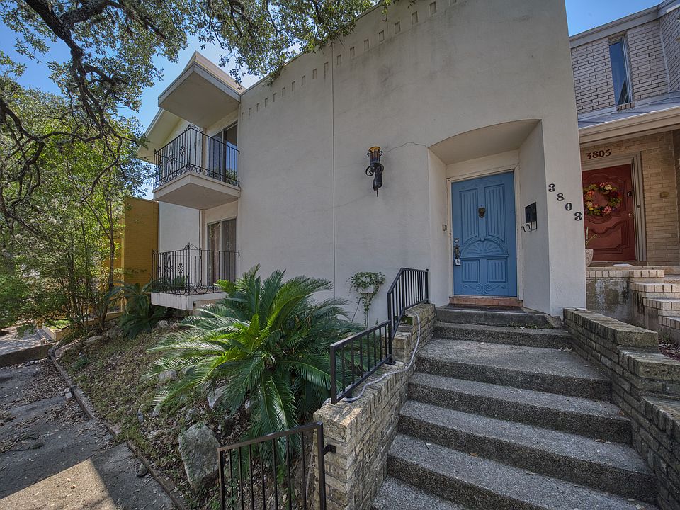DRAMATIC OPEN FLOOR PLAN IN MOCKINGBIRD HILL NEAR MED CTR W/ SPANISH CONTEMPORARY FEEL, GORGEOUS MATURE TREES AND CHARMING REAR COURTYARD. SALTILLO TILE IN LIVING AREAS, 2 EXTERIOR BALCONIES, EXPOSED BRICK, MASTER W/ DUAL SKYLITE BATHS/ WALK INS AND LARGE LOFT/LIV AREA. LG LIV/ DIN W/ FIREPLACE, 13 FT CEILINGS, BUILT INS AND SKYLIGHTS. GREAT STORAGE INCL WALK IN CEDAR CLOSET. 2 CAR REAR ENTRY GARAGE W/ GUEST PKG IN FRONT. GREAT ROOMMATE PLAN MSTR 3RD FL, BED2/3 1ST, LIV & DIN 2ND FLOOR.