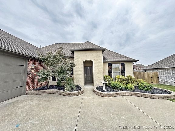 Beautifully maintained 3 Bed/2 Bath one-owner home in highly sought-after Grand View Heights next to Hilldale Hornets Stadium! Modern upgrades, open spaces, and thoughtful design make this property truly stand out. The two-toned brick exterior, painted front alcove flanked with planter beds, and extended driveway leading to a side-entry garage create impressive curb appeal. Inside, 10-foot ceilings and crown molding enhance the bright, open-concept layout. The living areas feature seamless engineered hardwood floors, ceiling fan, and built-in surround sound. The stylish kitchen offers quartz countertops, Samsung Bespoke smart appliances feat. five-burner gas range w/multiple oven configurations, refrigerator w/beverage center a& dual-style ice maker, two pantries, soft-close cabinetry, and a movable island w/seating for three. Enjoy pure water w/a whole-house two-stage filtration system plus a three-stage reverse osmosis system at the sink. The primary suite includes a whirlpool soaking tub, rain head shower, and spacious walk-in closet. Two additional bedrooms feature ceiling fans and plush carpet; one includes a built-in Murphy bed—ideal for guests or an office. Additional highlights include tamper-proof outlets, EV charger, security system with outdoor cameras, and high-speed fiber optic internet availability. Relax outdoors under the covered patio overlooking a spacious backyard with a 6-foot privacy fence surrounding two-thirds of the backyard. A 6x8 in-ground storm shelter adds peace of mind. Located less than a mile from Hilldale Schools and minutes from the Turnpike, I-40, and Highways 51, 351, 412, and 62—offering offering both convenience and connection. Modern comfort, thoughtful upgrades, and a prime location—this Grand View Heights home checks every box!