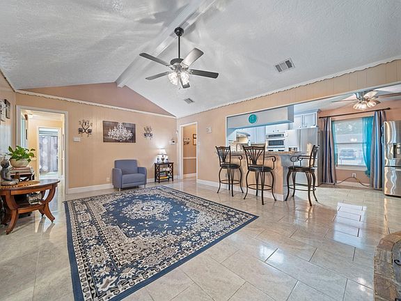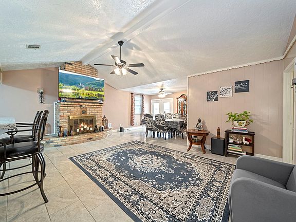 Brick hearth fireplaceGreat backyard with patioStainless steel appliancesTile flooringVaulted ceiling family roomGranite countersHandy storage building