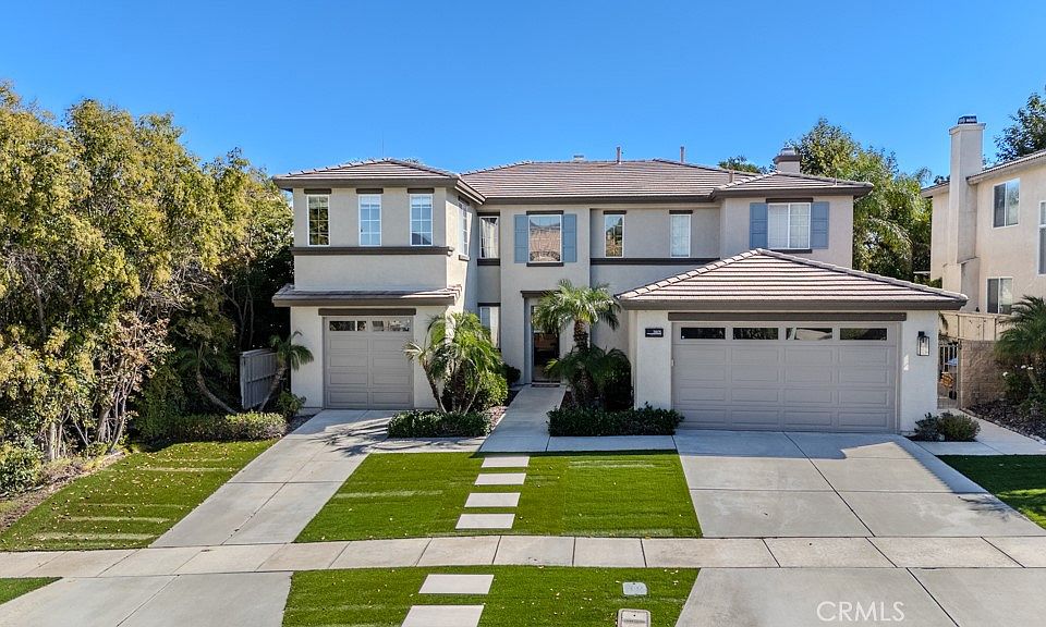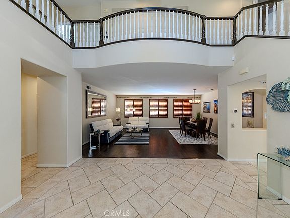 Stunning luxury home offers 4 bedrooms, 3 full bathrooms, and a game room/recreation room. It features soaring ceilings, crown molding, elegant wood flooring, and a bright open floor plan. The spacious, bright and inviting living room with wood flooring flows seamlessly into the formal dining area. The gourmet kitchen opens to the family room. The open kitchen offers a large island, stainless steel appliances, brand new gas range top and vent, granite countertops, a built-in microwave, and a large walk-in pantry. The spacious family room with a cozy fireplace leads to a resort-style backyard with a sparkling pool, spa, fire pit, built-in BBQ, and mini refrigerator, perfect for entertaining. One bedroom and a full bath with a walk-in shower are located on the main floor. Upstairs showcases an impressive and expansive primary suite with a retreat area featuring a fireplace and built-in shelves. The luxurious primary bath includes dual sinks, a walk-in shower, a separate soaking tub, and a huge walk-in closet. Two additional bedrooms, a full bath, and a large game/recreation room complete the upper level. Additional highlights include two A/C units, double-pane windows, wood shutters, recess lightings, a finished 3-car garage with built-in cabinetry, a whole-house fan, laundry room with a sink, and new ceiling fans. No HOA. Conveniently located across from a beautiful greenbelt and close to shopping, restaurants, hiking trails, parks, and the 15, 91, and 71 freeways.