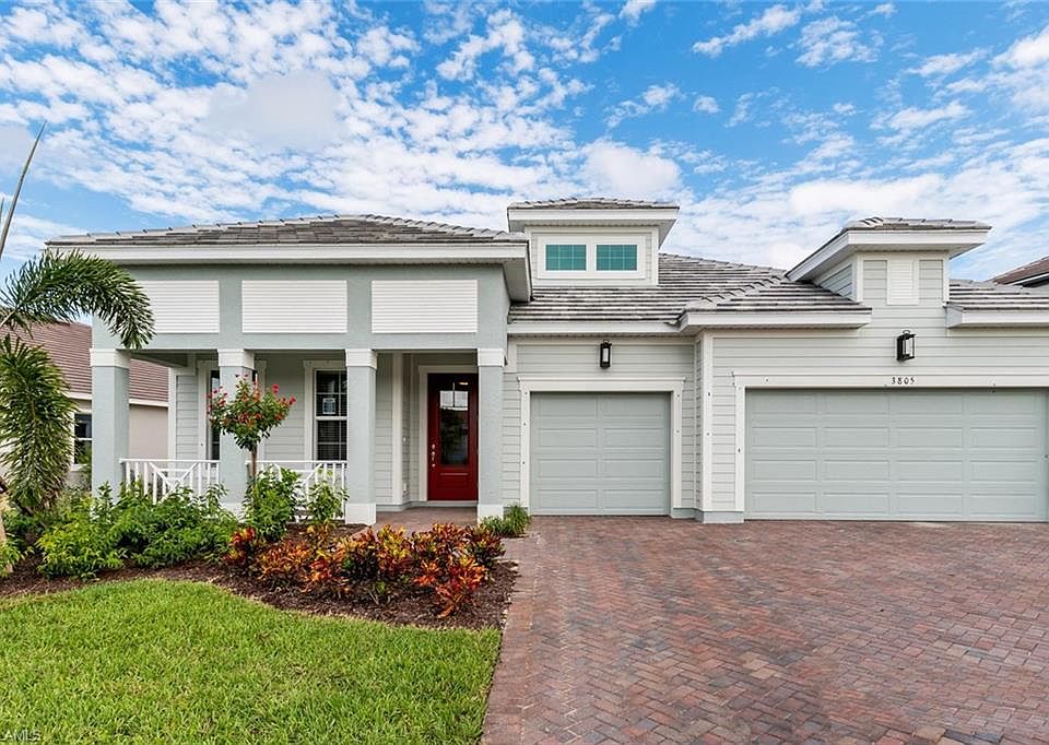 BRAND NEW construction, a Regatta model with an upgraded Coastal elevation is an immaculate single family home. Exceptional living begins with this 4 bedroom, plus study, 3 full and 2 half baths, and 3 car garage. Home features a large open great room; formal dining room; Chef's kitchen with Zodiaq counters, glass backsplash, 42 inch cabinets, and stainless steel appliances. Upgrades include: tray ceilings at the foyer, 5¼ inch baseboards throughout the home, plank tiles in the great room, and upgraded lighting. Owner's suite with a walk-in closet, owner's bath with dual sinks, Zodiaq counter tops, walk-in shower; study with French doors; screened lanai with an oversized lot. This single story home sits on a 92ft wide pie shape lot with room for a pool. Compass Landing is a private and secluded gated community featuring DEEP LOTS from 50ft-60ft wide and 130ft-180ft long with low association fees! Located in North Naples and minutes to I-75, Mercato, beaches and zoned with "A" rated Collier County public schools. Enjoy a 2,600sf amenity center, resort-style pool, clubhouse, tot lot and fitness center.