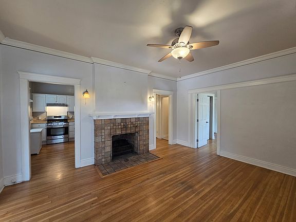 Decorative fireplaceCovered front porchOff street parking spaceStainless steel appliancesSpacious newly renovated kitchenHardwood floors