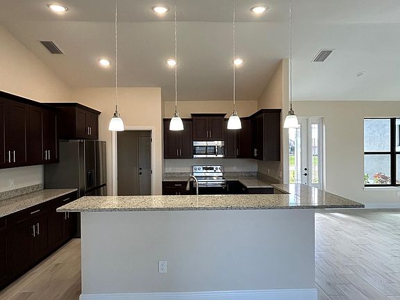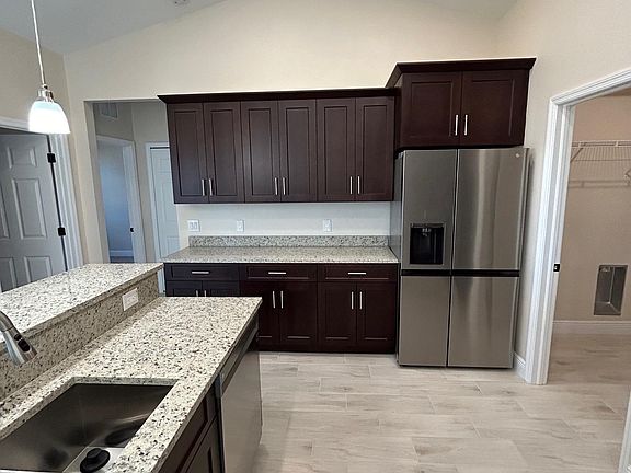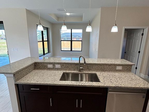 New 2024 construction home located in SW Cape Coral neighborhood. Home has 3 bedrooms 2 bath, indoor laundry all new stainless steel appliances. Has W/D hook ups ( not including washer and dryer) 2 car garage, coffered ceilings in master bedroom, 2 walk in closets, large double entry shower and his and hers bathroom sinks. Second bedroom has ensuite and entry to back yard. Screened in Lanai on patio with doors from master and slider from living room.