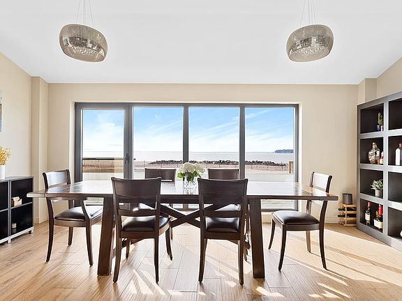 A one-of-a-kind contemporary beachfront oasis awaits you in coveted Sea Gate, an exclusive, historic Coney Island community steps from the ocean! Malibu style meets NYC chic in this incredible 5,000 sf single-family ocean front home boasting breathtaking views and a private sandy beach! This rare Brooklyn gem boasts 4 impeccably-designed stories, 4 spacious bedrooms, 4.5 high-end imported tile baths, generous living/entertaining areas & fabulous outdoor spaces on every level including a rear patio, backyard and rooftop! Pull up in your 2-car driveway for an incomparable luxury resort-like living experience. Particularly notable is the superior craftsmanship of this modern jewel, constructed with energy efficiency and safety/durability top of mind. Under the Jerusalem stone facade, a concrete superstructure is wrapped in Henry Blueskin waterproofing material. Massive windows bring the outside in. Jaw-dropping interiors make a sleek, stunning statement yet are warm and welcoming, with rich hardwood and heated floors, and walls of glass inviting a flood of natural light. A unique glass elevator transports you from floor to floor, in addition to interior stairs. The first level greets you with lovely front patios, one accessing the great room, and the other, an office for working remotely. Host guests with ease in the expansive open-concept living room, dine while gazing at the beach, cook like a gourmet in the top-of-the-line kitchen with Caesarstone counters and premium appliances. Glass doors open to a beautiful beachfront terrace for cocktails; plus there's a convenient, richly-appointed powder room nearby. On the 2nd floor are 3 sun-bathed bedrooms with ample closets and private balconies. One bath is en-suite; another is shared. Level 3 is reserved for the primary bedroom retreat offering 3 private balconies, huge dressing room, and spa bath with soaking tub, separate shower & ocean views. Enjoy the sights and sounds of the ocean, amazing sunrises/sunsets, and vistas of the Atlantic Ocean, Verrazano Bridge, NYC skyline & Coney Island Lighthouse from your wonderful rooftop deck; or throw summer parties on the sunken patio off the basement, with steps to the large grassy ocean-facing yard. The finely finished lower level is a haven for kids and adults with a big recreation room, wet bar, home gym, yoga/spa room & 12-person sauna. Here you'll also find a full laundry room & 200 sf storage room! Not enough can be said about this resort-like paradise with every amenity that must be seen to be appreciated. Close to shops, restaurants, the boardwalk & other attractions, as well as the F, D, N & Q trains to Manhattan at Stillwell Avenue.