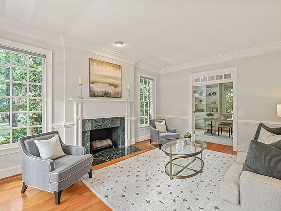 Classic southern elegance and charm. This stunning home is nestled into a quietly landscaped and mature lot. Be greeted by the open foyer that looks all the way through the home to the spectacular 2 story family room windows. Spacious study with built in bookshelves and charming bay window. Gracious entertaining spaces, natural light throughout and french doors on both levels to access the fabulous double porches. Freshly painted and new carpet on the second floor make this a move in ready home.